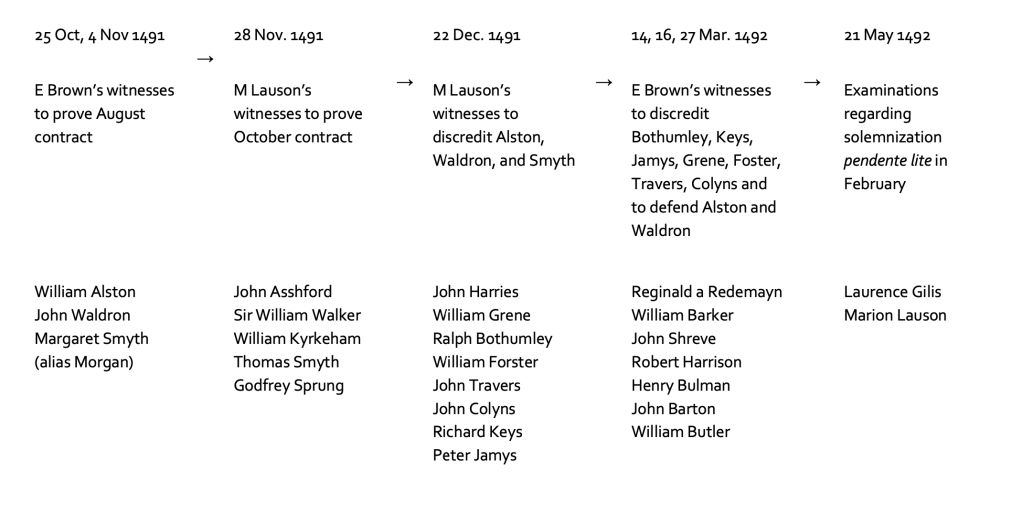 William Alston, tailor, of Hospital of St. Katherine by the Tower, London, where he has lived for seven years and more, forty years old and more, of free condition. Produced, admitted, sworn, and diligently examined as a witness, first concerning his knowledge of persons, he says that he has known Elizabeth Brown for four years and Laurence Gilis for twelve years and more as he says. Questioned further and examined on the first article of the libel, this witness says that he heard it said by others several times that they had discussed and talked about contracting marriage between them, and otherwise he knows nothing to depose concerning its contents. To the second article of the libel, questioned, this witness says that on a certain Sunday immediately preceding the feast of St. Laurence last past [i.e. 7 August 1491] this witness was present in the house of a certain John de Grave, beermaker, situated in the parish of St. Botulph without Aldgate, when he heard Elizabeth and Laurence contracting marriage together, as follows in English, Laurence first speaking to Elizabeth, “Elizabeth, [?doug…], may ye find in your heart to love me as your husband?” And she responded “Ye, by my faith.” Then Laurence said to her, “Give me your hand. I Laurence take you Elizabeth to my wedded wife, to have and to hold, and thereto I plight thee my troth,” and they unclasped their hands. Then Elizabeth similarly responded and said to Laurence, “I Elizabeth take thee Laurence to my husband, and thereto I plight thee my troth.” To the third, he responds and says that he has nothing to depose concerning its contents. To the fourth article, he says and answers that Laurence gave Elizabeth, as to his wife, a certain sum of money, what sum he cannot specify, and to its other contents he has nothing to depose […]. To the fifth article of the libel, he says that all the things that he has deposed are true, and concerning them public voice and fame circulated and circulate in the parish of St. Botulph without Aldgate and other neighbouring parishes and places. To the first interrogatory, he says as he said above concerning the libel. To the second interrogatory, he responds as he said above. Moreover, he says that ten years ago he lived in his own house in the parish of St. Peter by the Tower,[1] London. To the third interrogatory, he denies its contents. To the fourth interrogatory, he says that he has her in as much friendship as he has his other neighbours, and he denies its other contents. To the fifth interrogatory, he responds as he said above in the libel and he accounts for his knowledge regarding the time of the beginning and making of the contract because he was there, and he was asked by Elizabeth to bear witness. To the sixth interrogatory, he says that there was present at the time of the contract John Waldron, his fellow witness, and no one else besides the contracting parties. Moreover he says that Laurence first spoke the words of contract to Elizabeth. To the seventh interrogatory, he says as he said above in the sixth interrogatory, adding this, that he saw the contracting parties sitting together at a table in the house of John Grave, beermaker, within the parish of St. Botulph. To the eighth interrogatory, he says the contracting parties were wearing gowns, that is Laurence wore a russet gown and Elizabeth a gown of crimson. And he says also that the contracting parties were at the time of the contract sitting together and drinking. To the ninth interrogatory, he admits its contents are true. To the tenth interrogatory, he says and answers that its contents are true, and he says also that he often went with her to Master Nicholas Trap and John Hothersalle to get advice and there he informed Master Nicholas and John about the marriage made between the aforesaid contracting parties. To the eleventh interrogatory, he responds negatively to the contents of this interrogatory. To the twelfth interrogatory, he denies its contents. To the thirteenth interrogatory, he says that he does not care who loses or who has victory as long as justice is done. To the fourteenth interrogatory, he denies all its contents. To the fifteenth interrogatory, he says as he said in the thirteenth interrogatory, and also he says that he would not spend any money for Elizabeth and that he has not received any money or anything else from Elizabeth for victory in her case. To the sixteenth interrogatory, he says that he would not give victory more to one than to the other if it were in his power to confer, but to the party having the right.