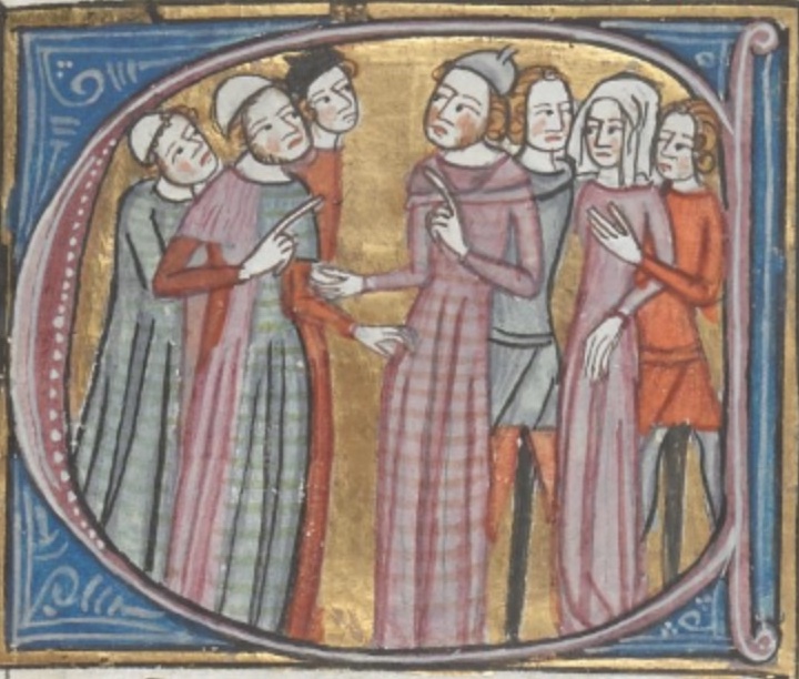 These words could be spoken anywhere, and as long as there were two adult witnesses, the contract was binding; if the exchange took place in the present tense it could not be dissolved even by mutual consent. Although through much of medieval Europe, the process of marriage saw a couple making a future promise of marriage (a betrothal) in a domestic setting before family and friends, and then later a present exchange of consent in a church, officiated by a priest, the practice in late medieval England was slightly different. As the depositions in the fifteenth-century London Consistory show, many, and arguably most, exchanges of vows to marry in the London area were made outside of churches, often in people’s homes, or sometimes in taverns or fields, and these exchanges were often made in the present tense. In other words, these exchanges were not betrothals (which could be broken, albeit not easily), but the act of marriage itself. The testimony also shows that the couple often went on, despite the legally binding quality of that initial contract, to undertake a number of other steps in the marriage process before they actually began to live as husband and wife. Banns (announcements of impending marriage) were made in the parish churches of both bride and groom, on three successive Sundays or holy days. A solemnization of the marriage, or church wedding, followed. Much of the marriage litigation in the Consistory derived from one of the partners refusing to go through with the rest of the process after having (allegedly) made one of those binding promises of marriage in a domestic setting.2